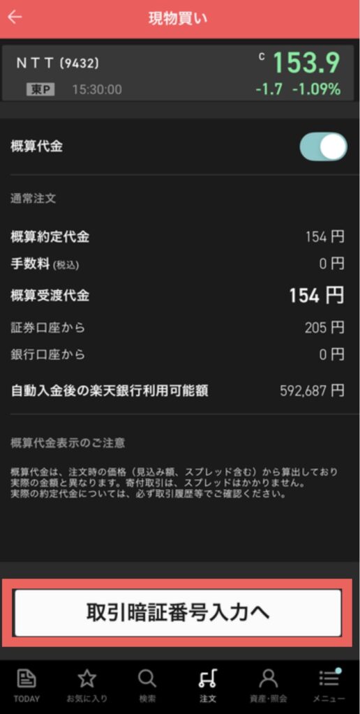 取引暗証番号を入力し発注をタップしてね!