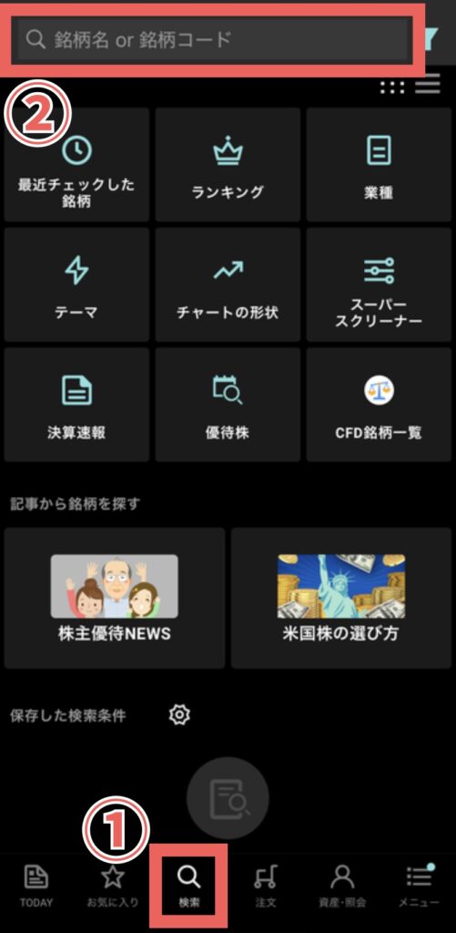「検索」をタップして、自分の買いたい銘柄を検索する。