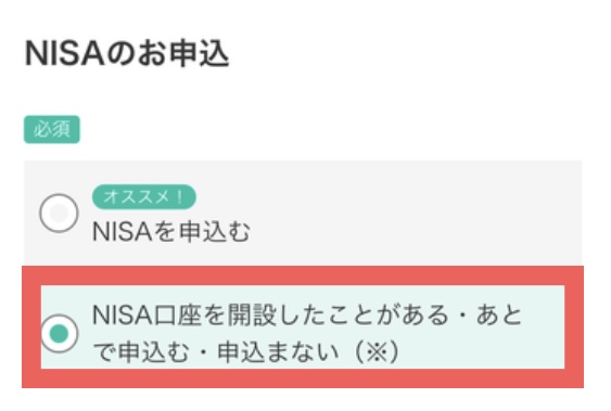 ・すでに他社(SBI証券や楽天証券など)でNISAを開設している人は「申し込まない」を選択