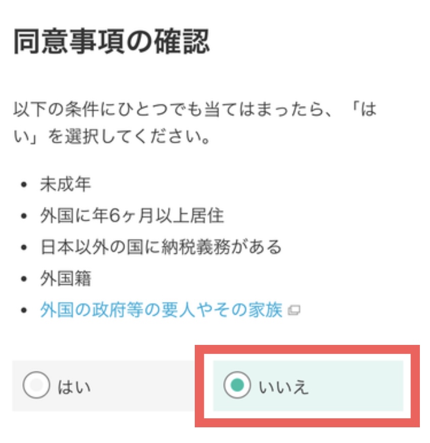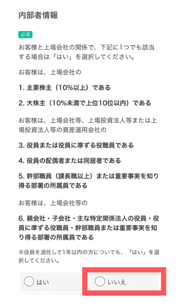 ・内部者情報の項目で、全て該当していなければ「いいえ」を選択