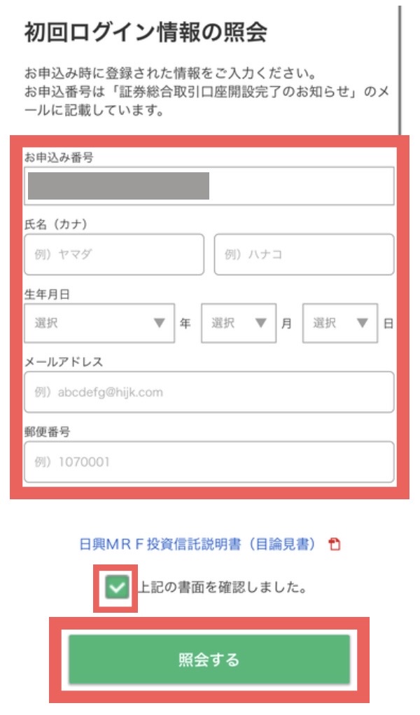 ・すぐ下の「目論見」を読んでチェックを入れたら「照会する」をタップ