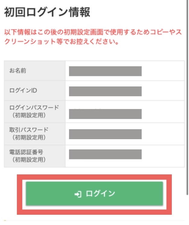 ・ログインIDやパスワードが表示されるので、必ずメモまたはスクショして「ログイン」をタップ