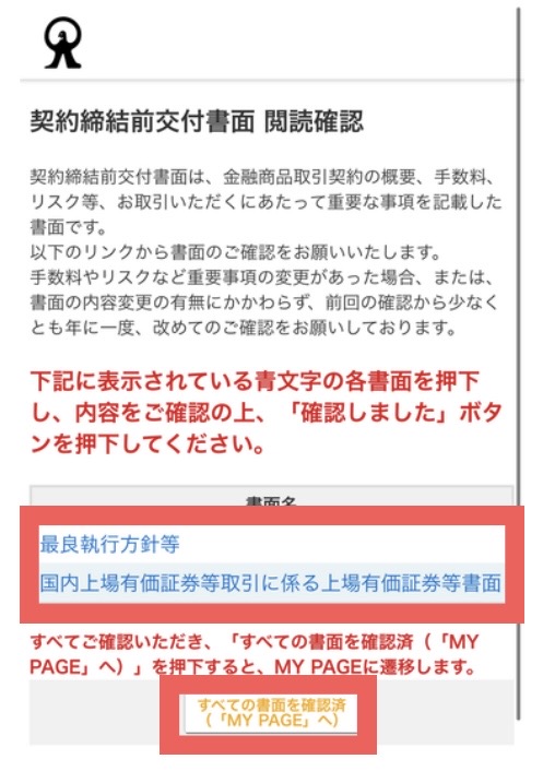 ・青文字の書面(2つ)をタップして確認したら、すぐ下にある「すべての書面を確認済」をタップ