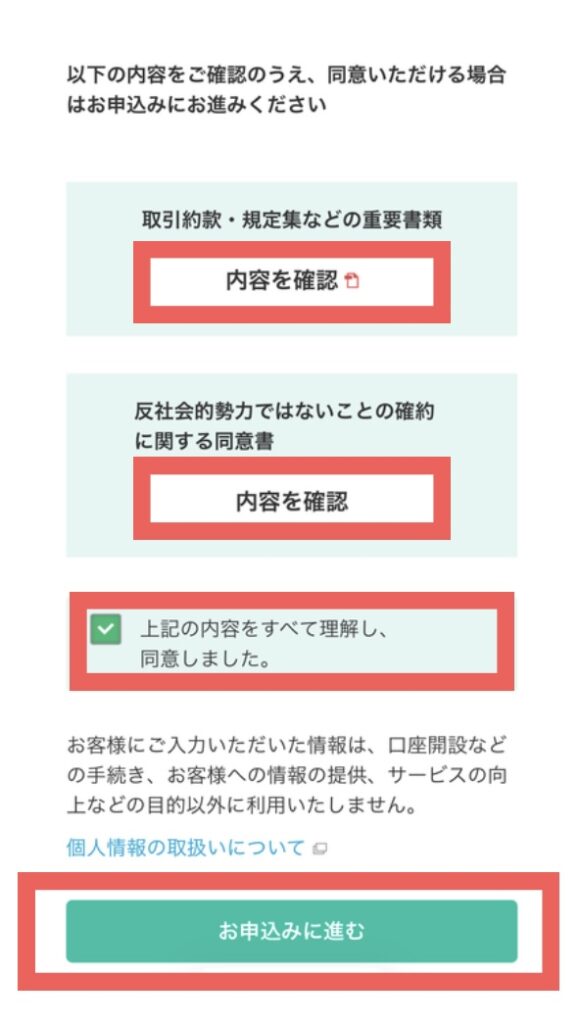 ・重要書類と同意書を確認して同意ボタンにチェックを入れ、「お申込みに進む」をタップ