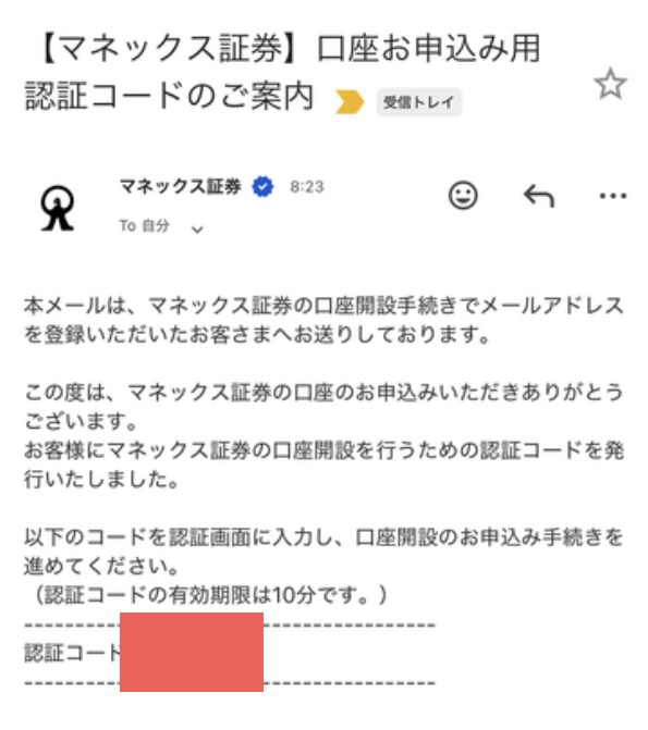 ・登録したメールアドレスに「口座お申込み用認証コードのご案内」が届く