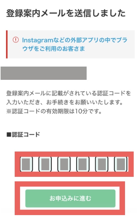 ・公式サイトへ戻り、6桁の認証コードを入力して「お申込みに進む」をタップ