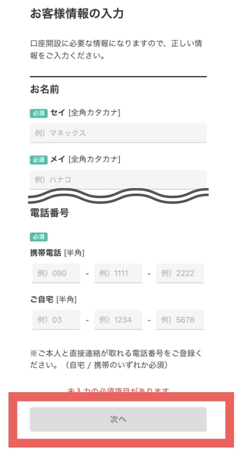 ・届いたメールに記載されている「お申込み番号」と、口座の申込み時に登録した内容を入力する