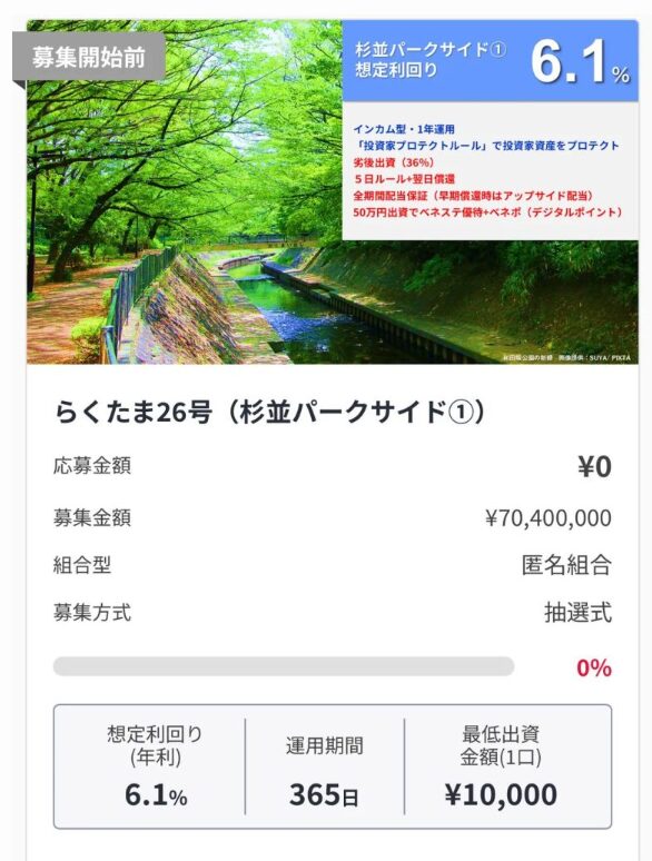 一般な不動産クラファンは優先劣後割合が20%程多いから、今回の案件は36%ってすごく高い水準でより安心材料だよね✊